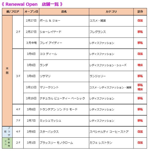 移転、改装、増床など、12店舗が装いを新たにリニューアルオープンします。
