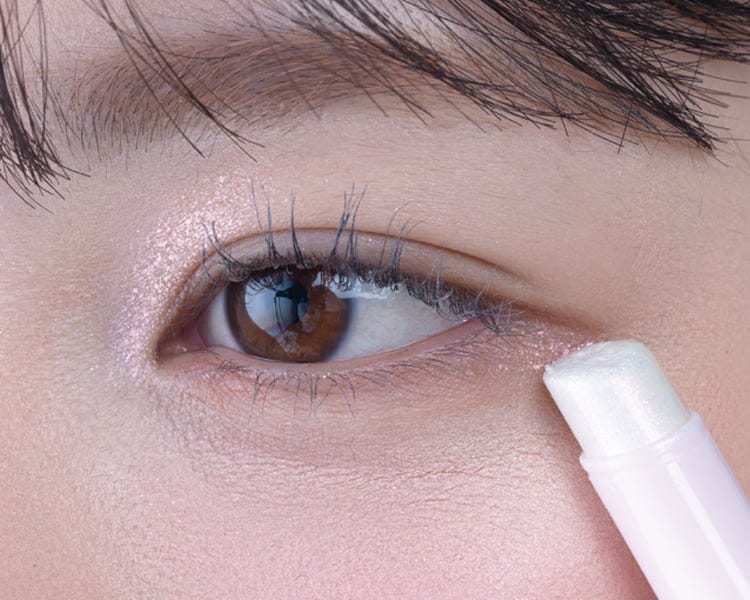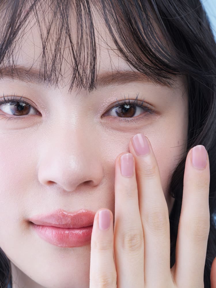 を少量だけ指にとり、目のクマにかかるくらい高めの位置にトントンとのばす。塗る範囲は目頭下から黒目下まで。チークも中心寄りにのせて、デートの高揚感を表現♡