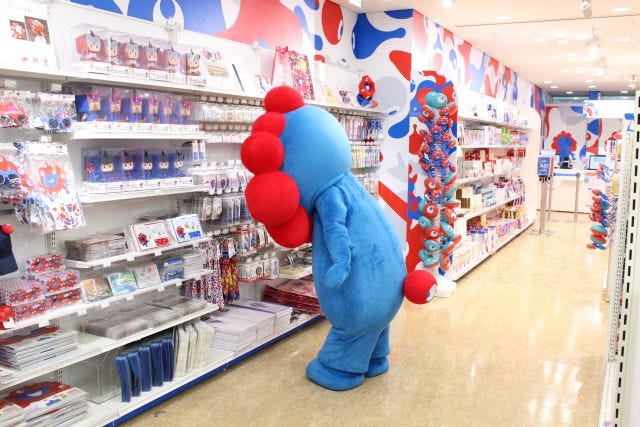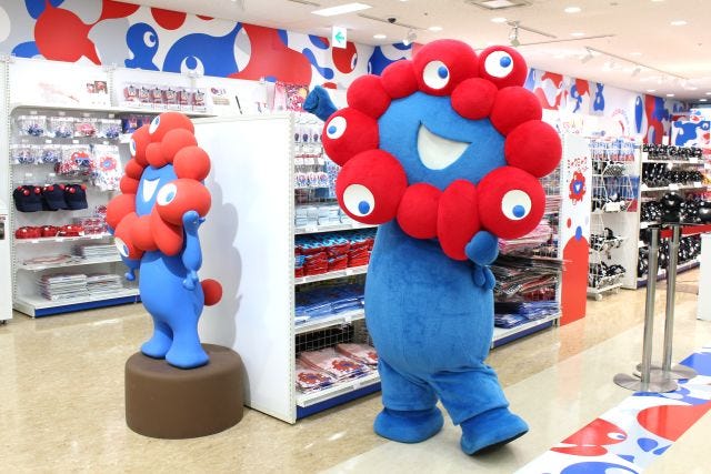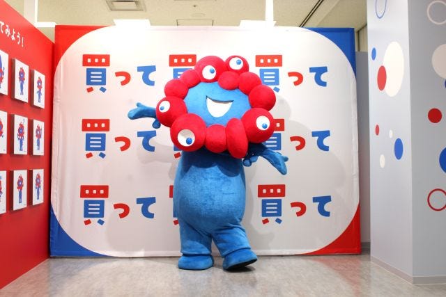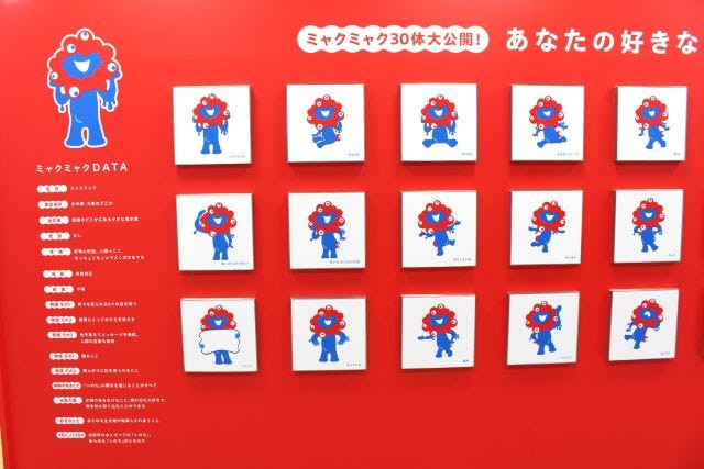 リニューアルオープンの初日にはミャクミャクも駆けつけ、パワーアップした店内を見学。内覧会に集まったメディアに向けて、バラエティ豊かな商品を見て回るかわいい様子も見せてくれました。
