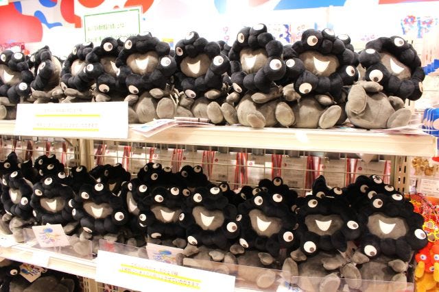 来店客の一番のお目当ては黒ミャクミャクのぬいぐるみ。「お手玉風ぬいぐるみ(S/M/L)」などがずらりとならびます。