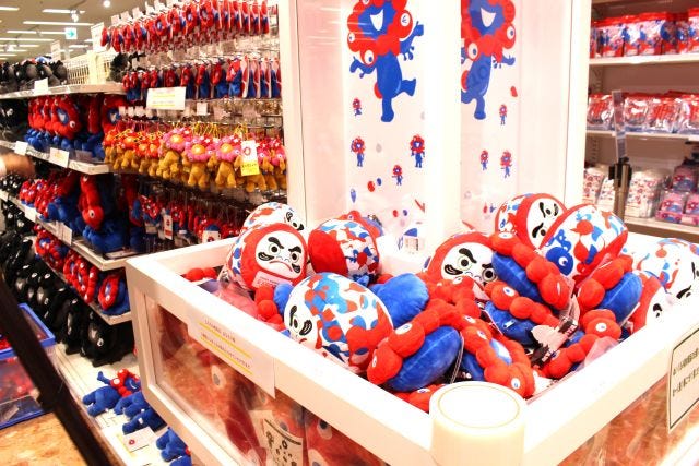 ストア内には万博会場内のオフィシャルストアで人気を集めた「ぬいぐるみタワー」を模したディスプレイが新たに登場。ミャクミャクやだるまのぬいぐるみがギュギュっと積まれています。