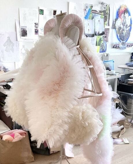 「今後もっと商業的な視点にも関心を広げていきたい」とマオさん。私自身も、デザインをどのように社会や市場と結びつけていくかに強い興味があります。アカデミーで学んでいた頃の私たちは、純粋に夢やファンタジーを追いかけていました。しかし卒業後、環境や立場が変わったことで、クリエイティビティーは失われるどころか、形を変えながら進化しているように感じます。学校で培ったのは、コミュニケーションとクリエイティビティーの基礎でした。その基礎があるからこそ、私たちはそれぞれの場所で新しい役割を引き受け、次のファッションを更新し続けることができるのだと思います。
