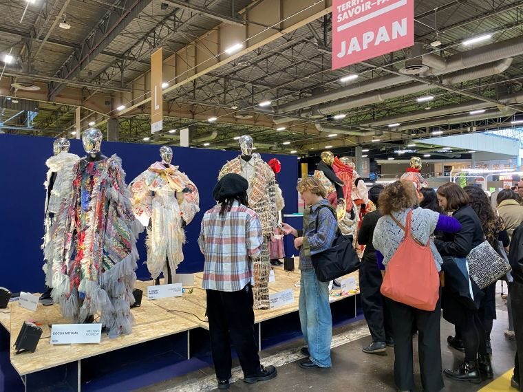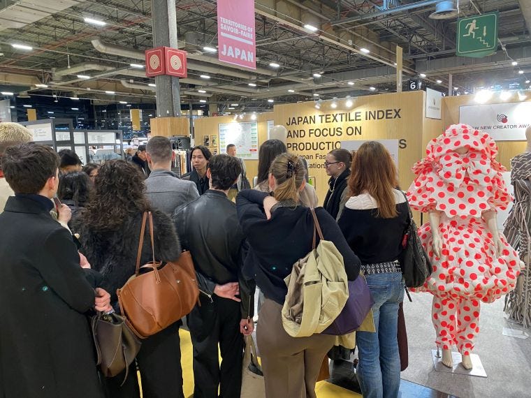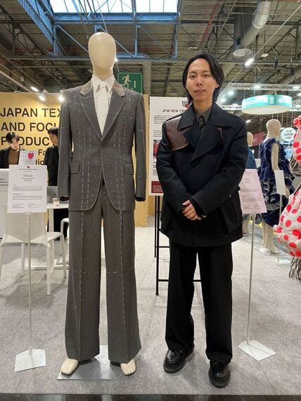 PVと提携する日本ファッション・ウィーク推進機構(JFWO)は、今年度から始めた「ニュークリエイターアワード」(NCA)入賞作品を展示。PVが協力し、NCA最優秀賞を受賞した文化服装学院の榊原叶真さんの渡仏を支援した。榊原さんは中伝毛織の生地で作った作品をPVパリで自ら紹介、来場客から「欲しい」と声を掛けられる場面もあったという。