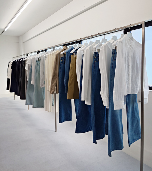 向かい側に並ぶ26年春夏コレクションは、デニムを引き立てるシンプルなワードローブに、素材やカットにこだわった機能美が反映される。透け感のあるコットンローンを使った白シャツは、体に付かず離れずのシルエットで清涼感がある。裾を直線でカットし、きりりとした印象で見せる。
