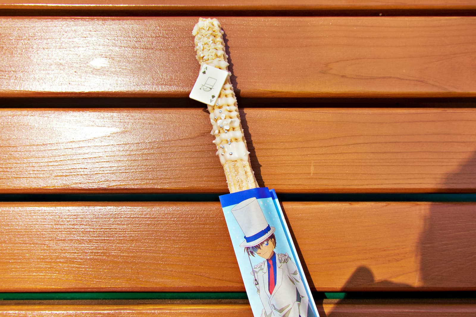 同じくカリフォルニア・コンフェクショナリー前のフードカートで販売されていたのは、そして、ホワイトカラーにゴールドがきらめく「怪盗キッド・チュリトス~ホワイトグレープ味~(850円)」。キッド様のようにエレガントな見た目とさっぱりした甘さで、歩きながら楽しむのにぴったり。おなじみの予告状付きなのもうれしいですね。