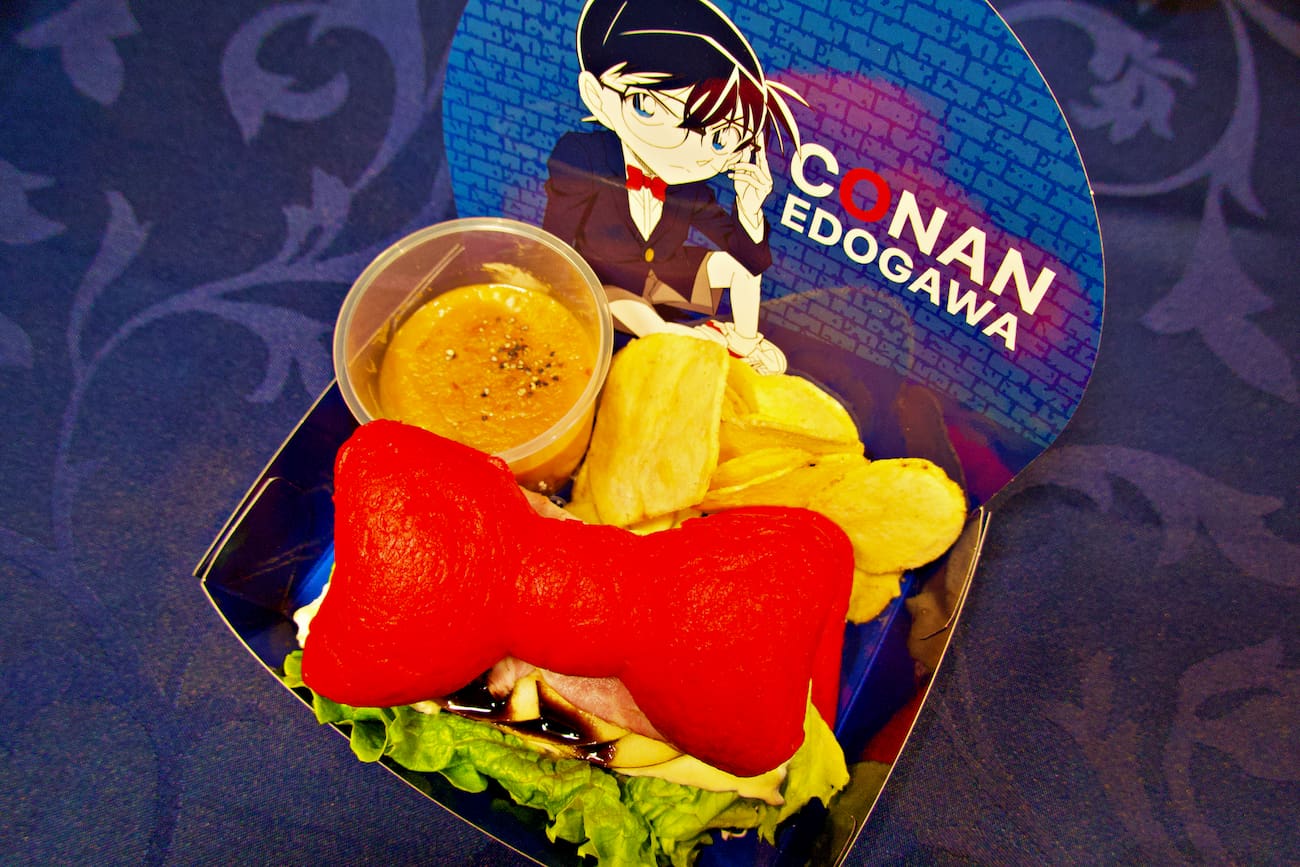 リアル脱出ゲームなどの謎解きには、「集中力」「記憶力」「瞬時の判断力」が重要。そこでおすすめなのが、ロンバーズ・ランディング前テラスで販売されている「蝶ネクタイ型サンドウィッチ ボックス(1,500円)」です。おなじみの蝶ネクタイ型変声機をモチーフにしたビジュアルがインパクト抜群。ハムチーズにりんごを合わせたサンドで、見た目以上に大人っぽい味わいがポイントです。