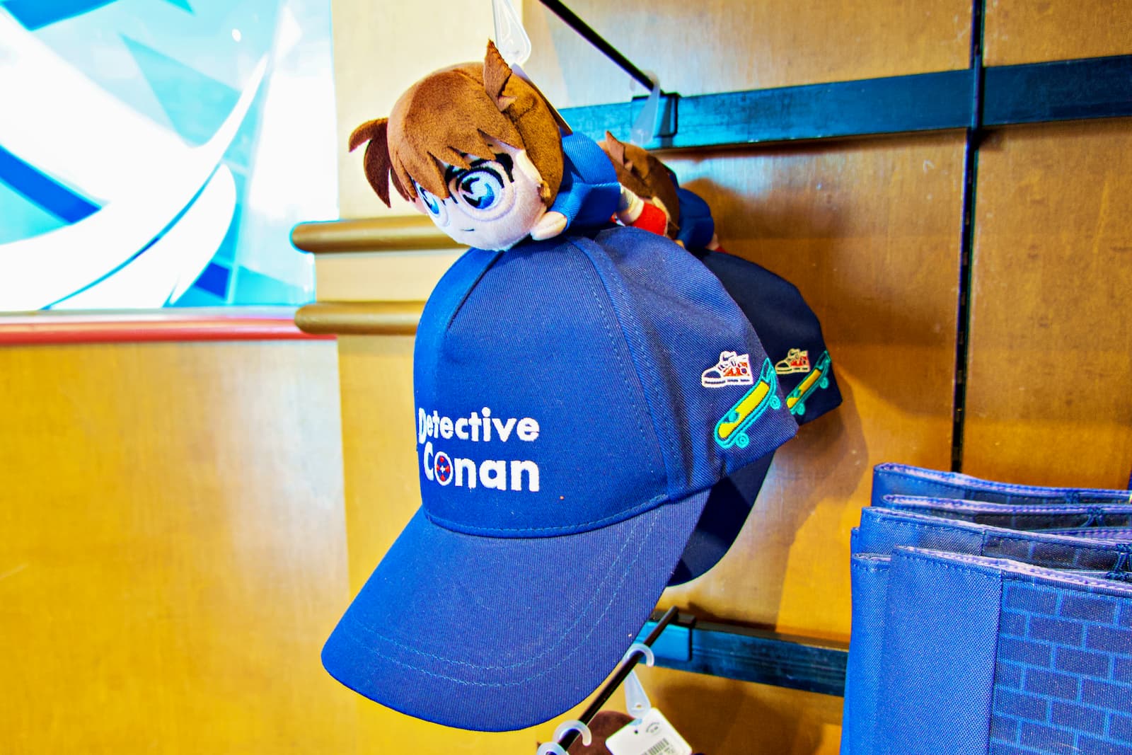 さらに、頭にちょこんとコナンが乗った「キャップ」(4,700 円)も見逃せません。うつ伏せ姿で見えにくいですがコナンくんの首元には蝶ネクタイなど、細部まで丁寧に再現。キャップのサイドにはターボエンジン付きスケートボードがデザインされ、ネイビーカラーでコーディネートに取り入れやすく、普段使いもしやすいアイテムです。
