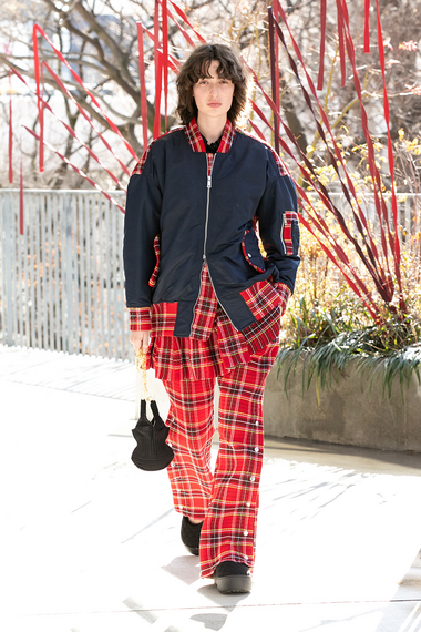 ゆがんだチェックとブラを重ね合わせるように編んだローゲージの半袖トップ。ケーブルニットに透かし編み、レースが連なるストレートスカート。ニットの柔らかなテクスチャーがフェミニンな印象に深みを出す。目を引くのは、リブ状に編み立てたタータンチェックのアイテム。ホールターネックのドレスは、チェックの編み地がウエストでふんわり広がって緩やかなフレアラインを成す。チェックを切り替えたMA-1に、キルト風スカートとパンツのレイヤード。ポリエステル糸を編んで構成したプリーツが軽やかに揺れ、キュートな魅力が映える。