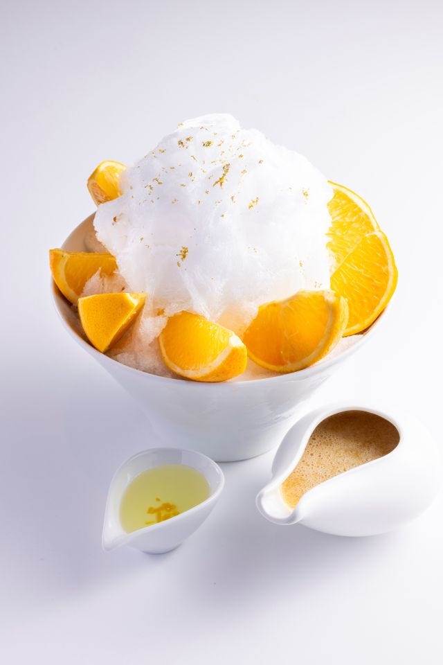 「はっさくのかき氷」(1,680円)/<タイムアウトマーケット大阪>ぎおん徳屋(南館地下1階) ※1日限定20食 注目は、1個半ものはっさくを使用したかき氷。和三盆や皇室御用達の蜂蜜を入れた上品な甘さの果汁を回しかけ、さらにピールシロップをかけることで味の変化を楽しめます。