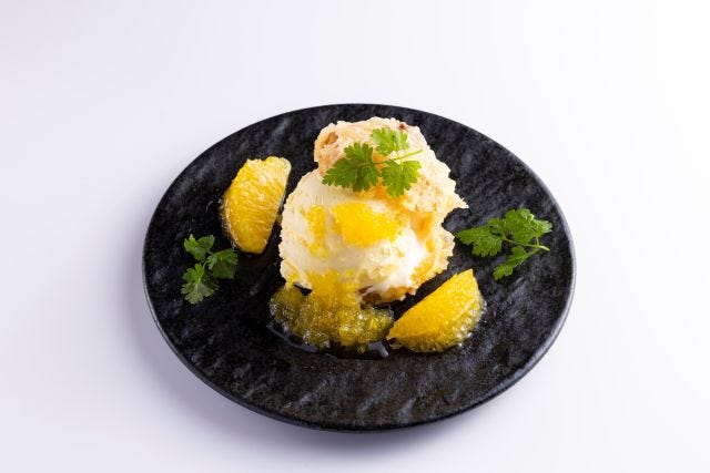 「シューアイス天 はっさくソース掛け」(748円)/寿司と天ぷら 鶴松 新 ~ARATA~(南館地下1階) ※1日限定5食、ディナータイムのみ