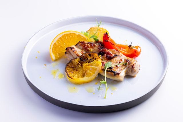 「はっさく香る、塩麹チキンロースト」(平日/2,200円、土日祝/2,400円)/Royal Garden Cafe(南館2階) ※ランチタイムのみ チキンをはっさくの果汁と塩麹のマリネ液に漬け込み、石窯で焼き上げた「はっさく香る、塩麹チキンロースト」。白ワインとのペアリングで、優雅なランチタイムを過ごせそうです。
