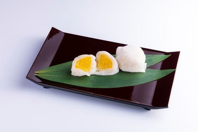 「はっさく大福」(1個/800円)/京都祇園 天ぷら圓堂(南館3階) ※1日限定5食 「シューアイス天 はっさくソース掛け」や「はっさく大福」など、食事のシメにぴったりなメニューも登場。数量限定販売です。
