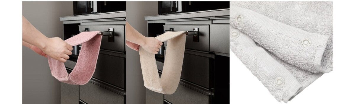 ニトリの『くるくるまわるキッチンタオル』は、2024年の発売以来、累計約14万枚を販売した大人気商品です。両端のボタンでタオルをループ状にできるため、タオルバーからズレにくく、回して乾いた面で拭けるアイデアグッズなんですよ。