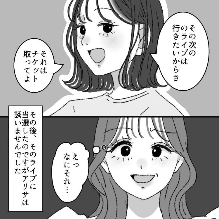 いつも一緒にライブに参戦している友だちのアリサに当選を報告しますが…?