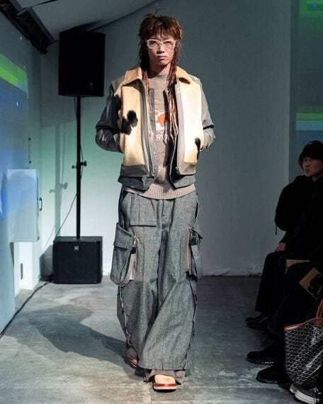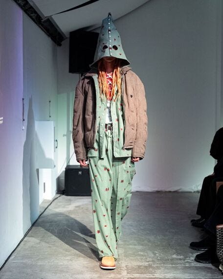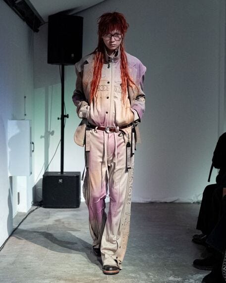 「セヴシグ」(長野剛識)は2月10日、ミッドウエスト東京店のギャラリーを会場に、映像のインスタレーションとともに26年秋冬のショーを行った。テーマはノットイコール。様々な領域で矛盾を抱え、ハレーションを起こしている世界を映し出す。