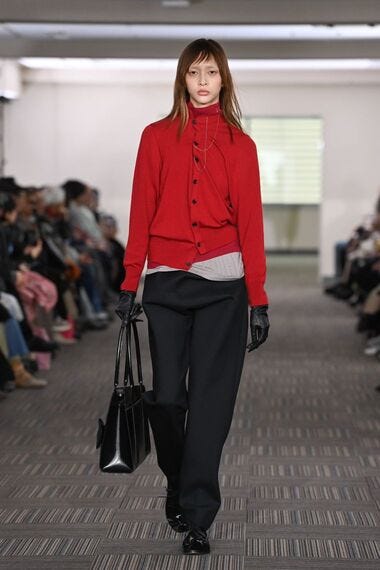 ドレスシャツは首元で布をツイストさせてゆがませる。ニットのアンサンブルも、ボタンを留める位置がずれて片方の身頃がゆがむ。その下にはフロントをイレギュラーにたわませたトラウザー。これまでもくしゃっと崩れた形でユニークさを出してきたが、素材の質を上げることでエレガントなドレープを描く。意図せずにたわんだシルエットにフェティッシュな魅力もはらむ。