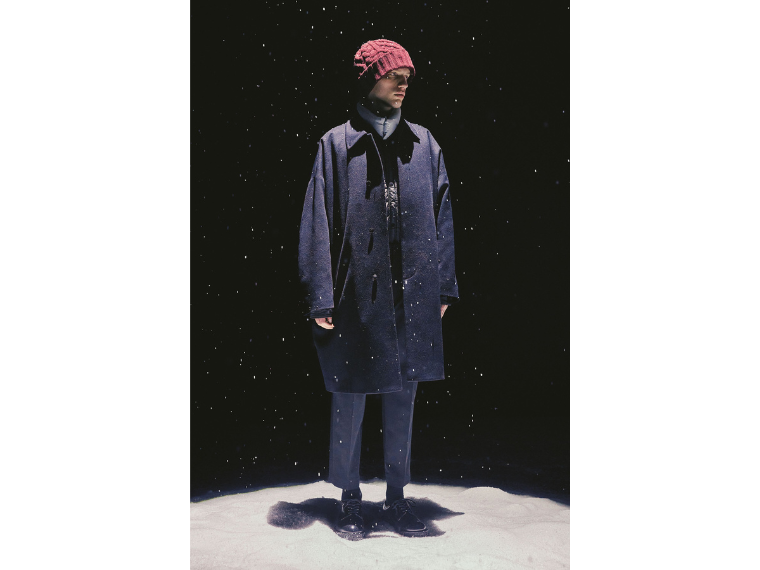 小雪がちらつく空間に立つモデルが着ているのは、クリーンな素材で仕立てた暖かそうなアウターと、少し明るめの配色が楽しい編み込みセーター。セーターの上にベストを重ねるなど、遊びのあるレイヤーリングも見せる。生地は、天然繊維の可能性を起点に、化学繊維それぞれの特性を再考してオリジナルで製作した。