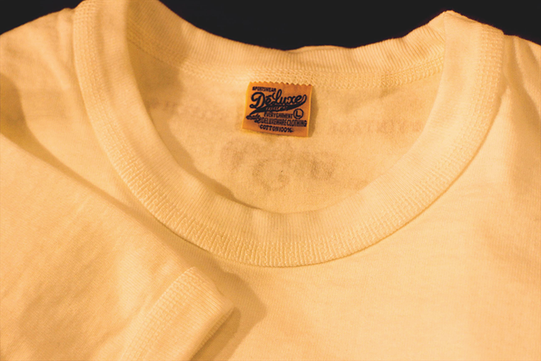 春夏物で打ち出した和歌山の旧式つり編み機による10.5オンスの天じくを使ったTシャツ(1万3200円)は、その象徴的なアイテムだ。ユニオンスペシャルをカスタムした完全オリジナルの5本針ミシンで襟や袖口を縫製した。