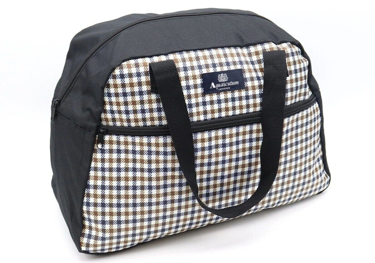 イギリスの老舗高級ブランド「Aquascutum(アクアスキュータム)」を象徴する、品格漂うクラブチェック柄のボストンバッグは、フロントにはブランドのクレストロゴを配した贅沢なデザイン。
