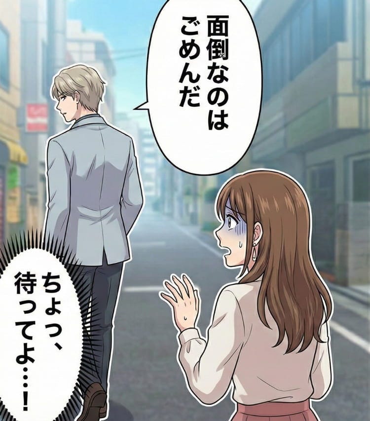 この気まずい状況に耐えきれなくなったのは、隣にいたマッチングアプリのイケメン男性でした。彼は彼氏の存在と事の顛末をすべて察知すると、大きくため息をつきました。そして「彼氏がいるなんて聞いてない。俺はもう帰るから」と冷たく言い捨て、彼女を庇うこともなくその場から足早に立ち去ってしまったのです。