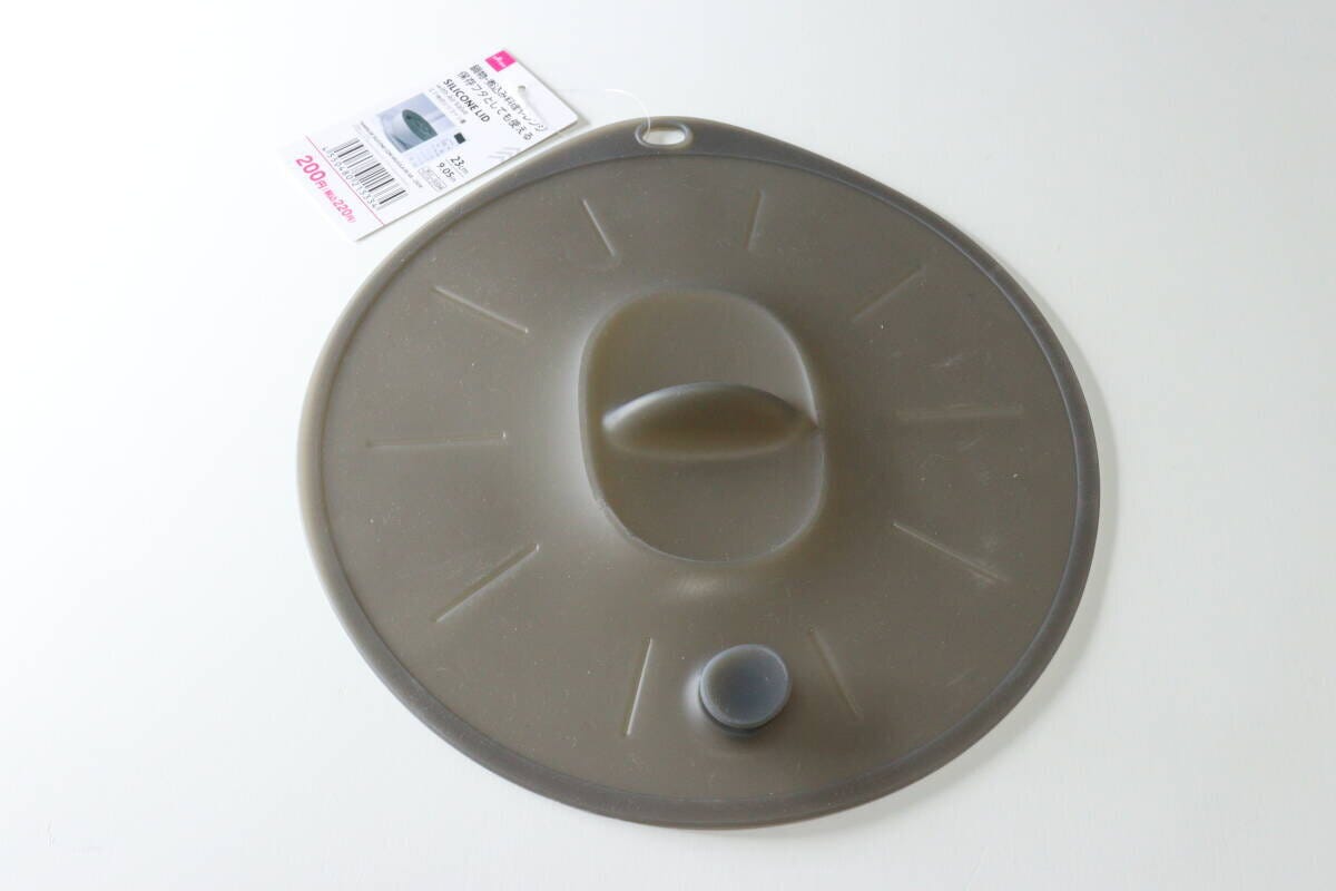 ダイソーをパトロールしていると、キッチングッズ売り場でシリコーン素材の便利そうなフタを発見。その名も『エア弁付シリコーン蓋(23cm)』です。