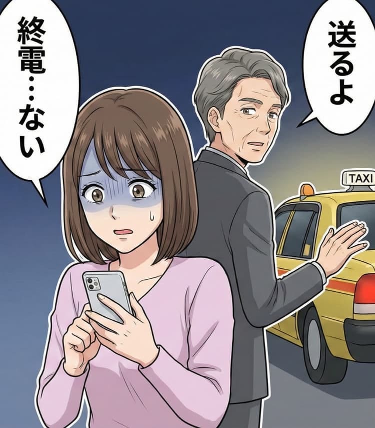 どうやって帰る口実を作ろうかと悩んでいるうちに、時計の針は無情にも進んでいきました。スマートフォンで時刻表を確認すると、なんと自宅最寄り駅に向かう終電の時間はすでに過ぎてしまっていたのです。