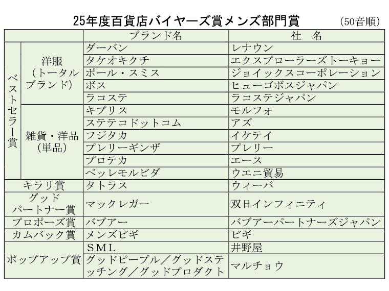 繊研新聞社主催「25年度百貨店バイヤーズ賞」メンズ部門 17ブランドが受賞
