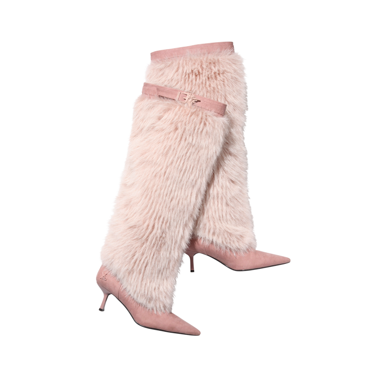 存在感抜群なロング丈のファーブーツ。ピンクで個性的に。