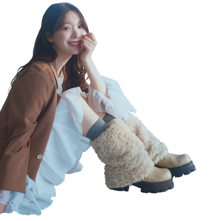 会った瞬間に目を引く、もこもこブーツが主役の旬バランスコーデ♡ やわらかな白ワンピにブラウンジャケットを重ねることで、甘さの中に大人っぽさをひとさじプラス。