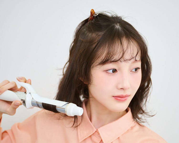 全体を上下に分けたら、下段から26mmのヘアアイロンで波巻きにしていく。まとめるので根元まで巻くのがコツ。上段も同様に巻いたら、前髪もしっかり内巻きに。