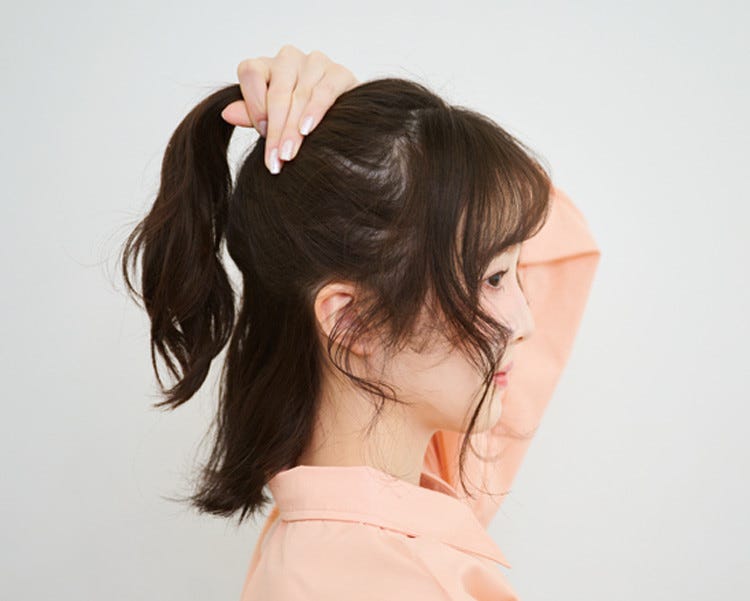 顔まわりの髪以外すべてを手グシで束ねる。鏡を見て正面からおだんごの山がちょこっと見える位置にゴムで結ぶ。えり足の髪が落ちちゃうコはそのままでOK。