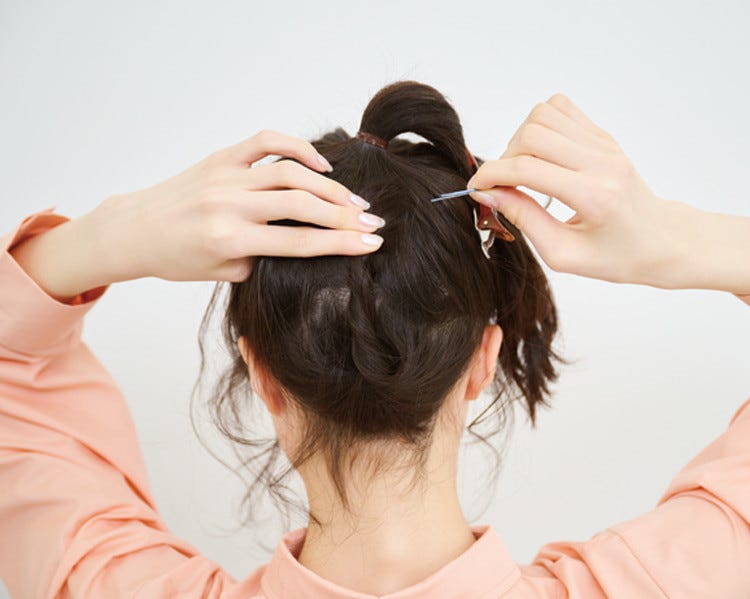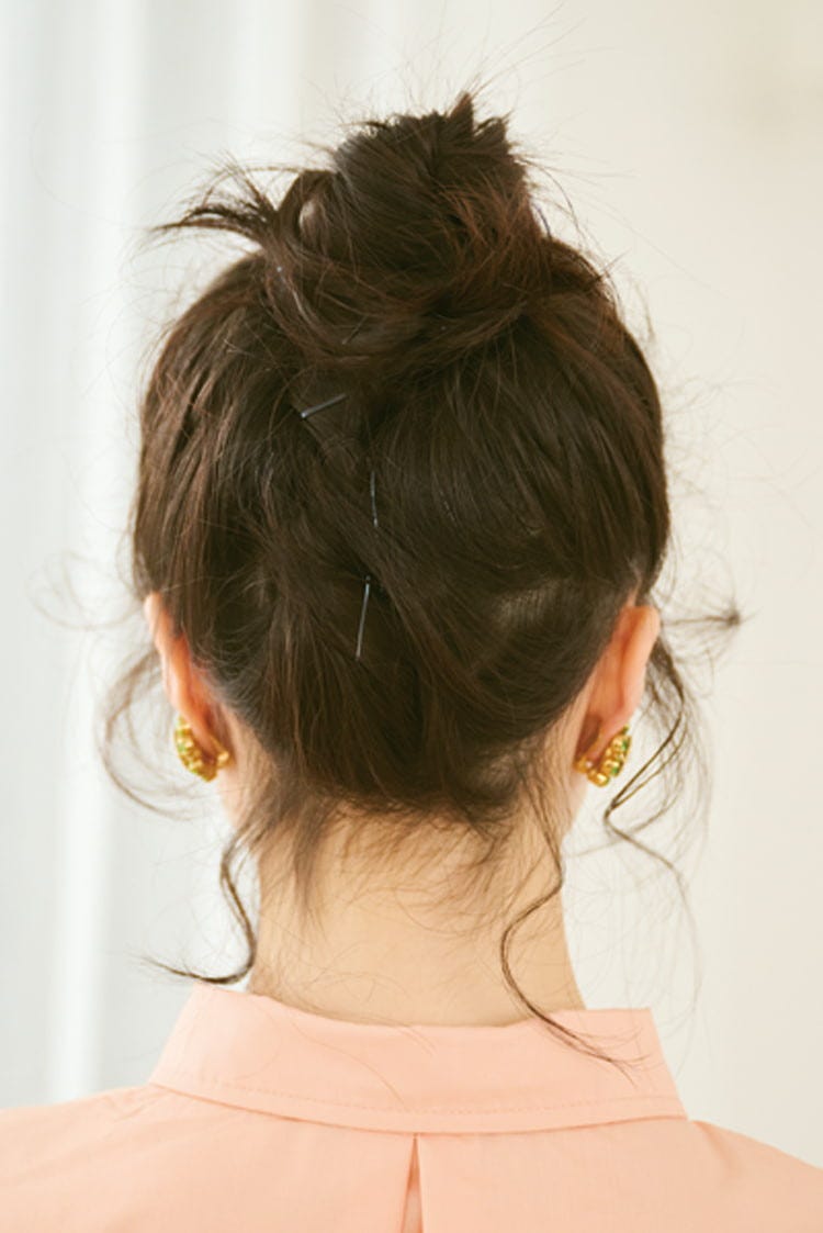 How to 2で結んだ髪は横によけておく。結べなかった髪は、えり足のおくれ毛を残してまとめ、束にしたらねじって上にあげてピンでとめる。