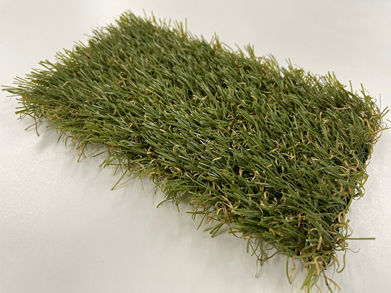 この人工芝は、カネカの生分解性バイオポリマー「グリーンプラネット」を使用し、土壌中だけでなく海水中でも生分解する特長を持つ。人工芝の葉は90%以上バイオマス由来の樹脂を使用。石油由来の人工芝に比べ二酸化炭素の排出量を低減できる。カネカの角倉護取締役副社長は「グリーンプラネットはスプーンやストロー、ホテルのアメニティーなどに採用されてきたが、人工芝の開発で耐久消費財として新しい用途の採用が始まった。今後も広げていきたい」とする。