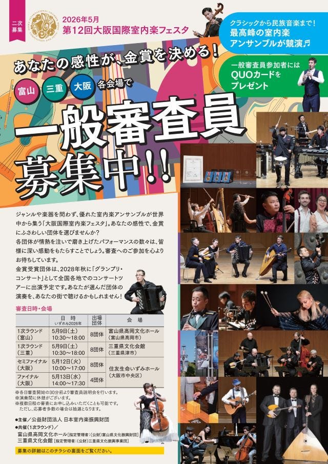 「住友生命いずみホール」で開催される 「第12回大阪国際室内楽フェスタ」の一般審査員を募集中です。2026年5月12日(火)のセミファイナル、13日(水)のファイナルを対象に、音楽好きの中学生以上なら誰でも応募可能。一般審査員参加者には、特典としてQUOカードのプレゼントもあります。