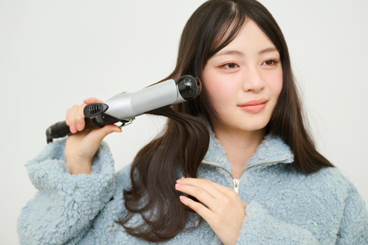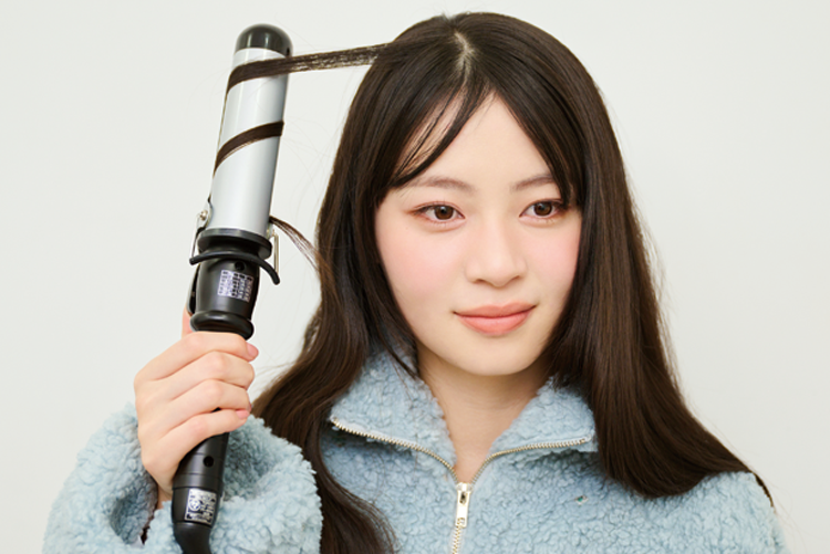毛先が外ハネするように、32mmのヘアアイロンで毛先から波巻きにしていく。耳前の髪は、ほおくらいの高さまで巻くのが◎。帽子をかぶったとき、顔まわりにふんわり感が出る。