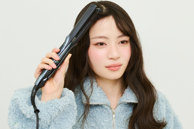 前髪はセンターで分け、ストレートアイロンは根元をはずし毛先をはさんだら、手首を返して外巻きに。帽子をかぶったら、バランスをみて出ている顔まわりの髪や前髪に巻きを足して。