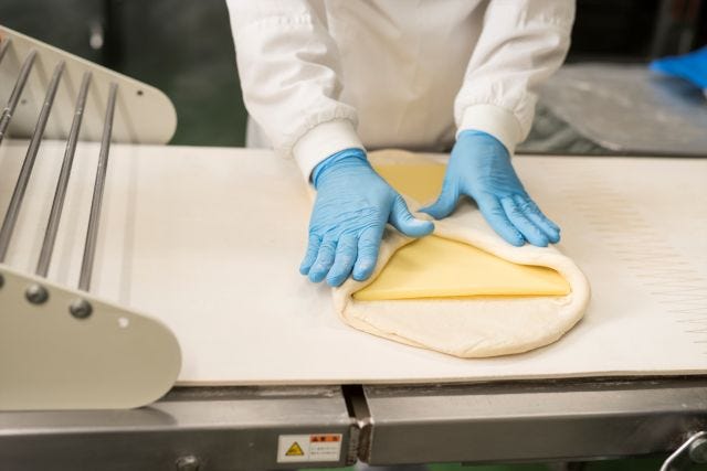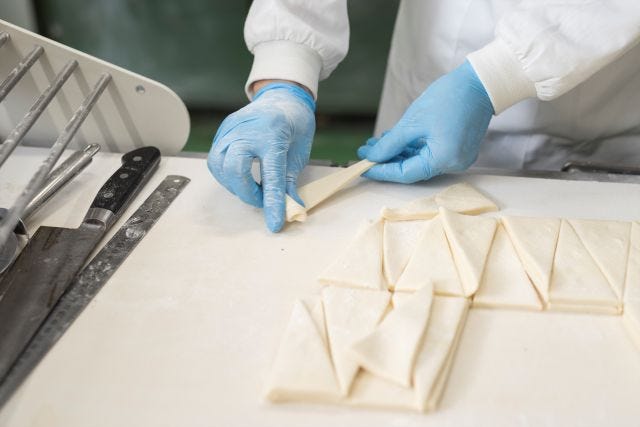 人気の秘密は“外はサクッと、中はモチッと“した独自の食感。機械では再現できない食感をだすため、創業以来、手作業で生地を折る”手折り製法“にこだわります。店舗数を拡大した現在もその製法は変わらず、全国13店舗分、毎日17万個以上の生地を手作業で仕上げる徹底ぶり。