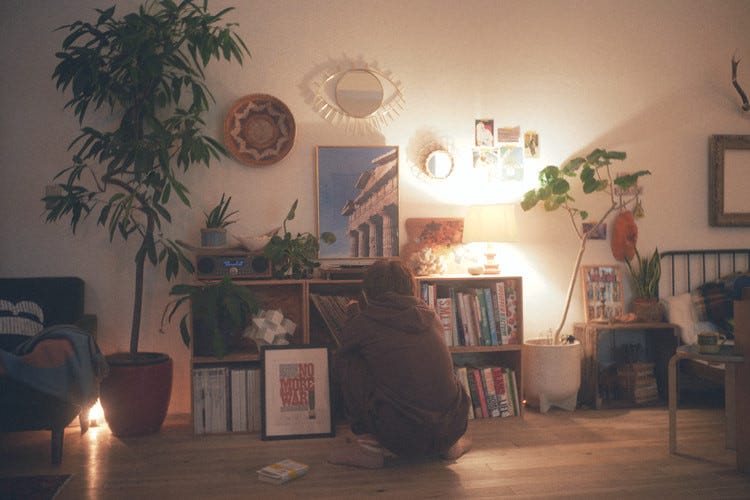 たくさんのCDやレコード、カセットテープ。しおりがわりにポストカードをはさんだ小説が並ぶ本棚。一緒に行った蚤の市で見つけたお気に入りのイスやマグカップ。