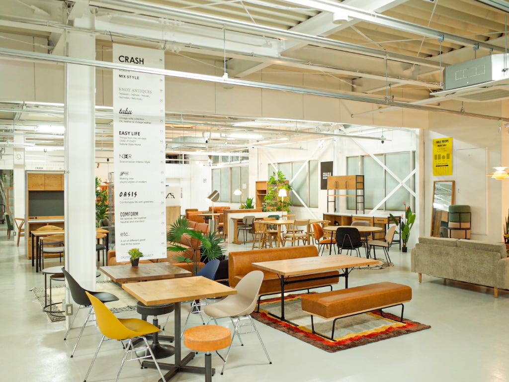 大阪府・兵庫県下で5店舗目となる「ウンコちゃんの家具屋さん 箕面店」の店内は、広さ1,315平方メートル、1階・2階からなるフロア構成。人気のオリジナル家具をはじめ、ヴィンテージライクなものから北欧テイスト、モダンなものまで、いろいろな暮らしになじむ家具がセレクトされています。