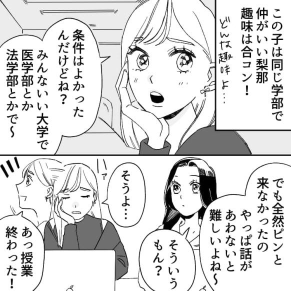 主人公には梨那という、合コンが趣味の友だちがいます。