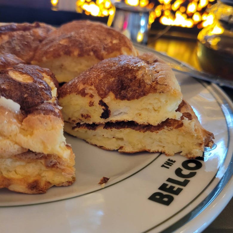 この厚みと密度の高い生地を見てください。そして、バターと粉砂糖が輝いています。実物は、反射でキラキラした海面のようでした。
