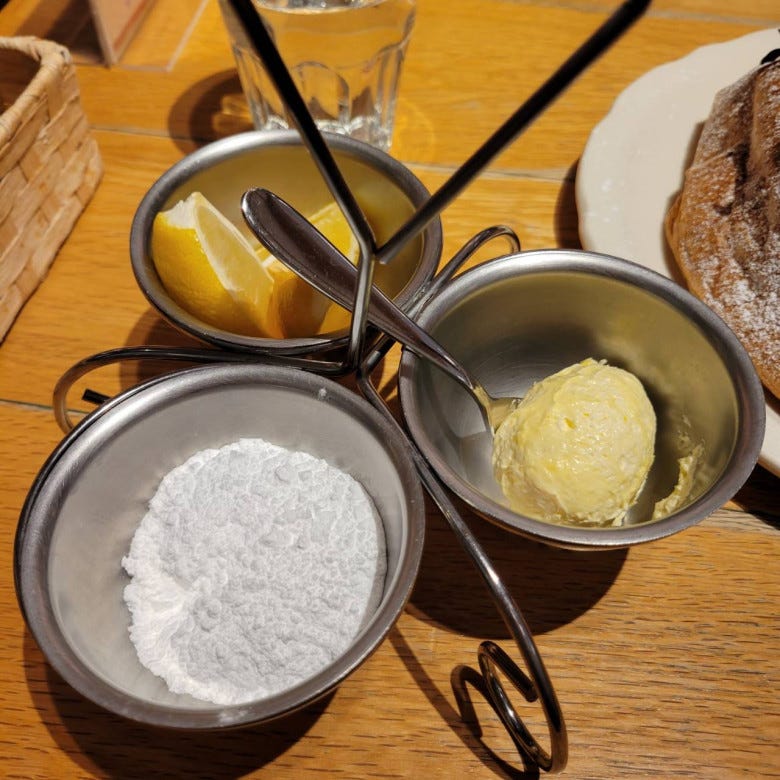 オススメの食べ方は、生地に満遍なくバターを塗って染み込ませた所にレモン汁と粉砂糖をかけることです。