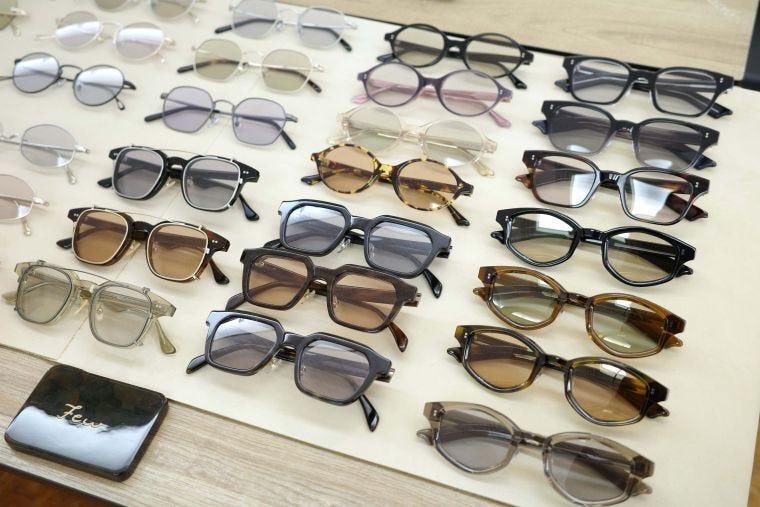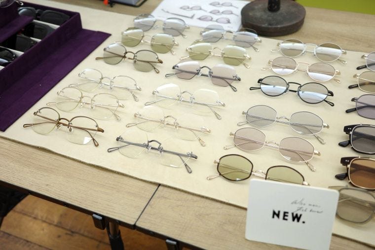 ショットブレイン(大阪市)は、オリジナルの眼鏡・サングラスブランド「ニュー」「フュー」を出展した。アメリカンビンテージのテイストを取り入れたニューは、26年春の新作でリムレスやメタルフレームの眼鏡を出す。ファッション眼鏡としてクリアレンズが人気なこともあり、昨年からクリアレンズの提案も増やしている。フューは伊の眼鏡生地メーカー、マツケリのものを使っている。テレビジョンカットなどフレームの形に遊びがあるものが多い。ニューが税込み1万5000~1万7000円、フューが1万7000円前後。