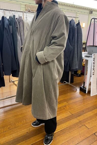 人それぞれの着こなしを推奨するアパレル「KONTRACT」(コントラクト)は、男女問わず違和感なく着こなせるデザインにこだわっている。ボタンの留め方次第で、2パターン以上の着方ができるものもある。アイテムは、遠州のコーデュロイを使ったローブ(4万9500円)やタックパンツ(3万5200円)、前身が2層なっていているジャケット(4万9500円)など。