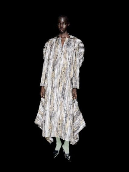 ゴールドやシルバーの輝きを放つ構築的なフレアドレス(税込み14万800円)にはインド製テキスタイルを採用した。細いペンで線を引いたような抽象的な柄が特徴的で、柄に重ねるように伝統的な金属糸のザリヤーンを刺繍した。