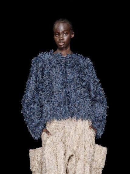 レディス「ディウカ」(田中崇順)は26~27年秋冬、得意の立体裁断による彫刻的なフォルムや3D効果のある素材でボリュームたっぷりの服を作った。オレンジやミントグリーン、ブルー、ゴールドなど様々な色も取り入れ、パワフルなコレクションになった。