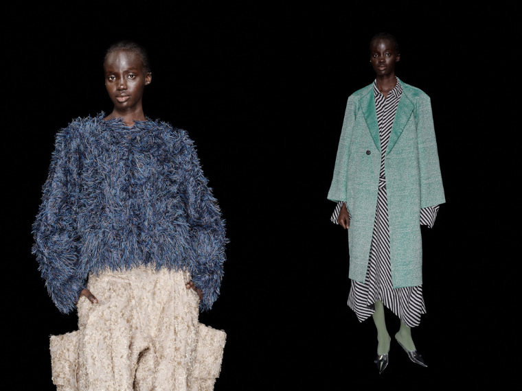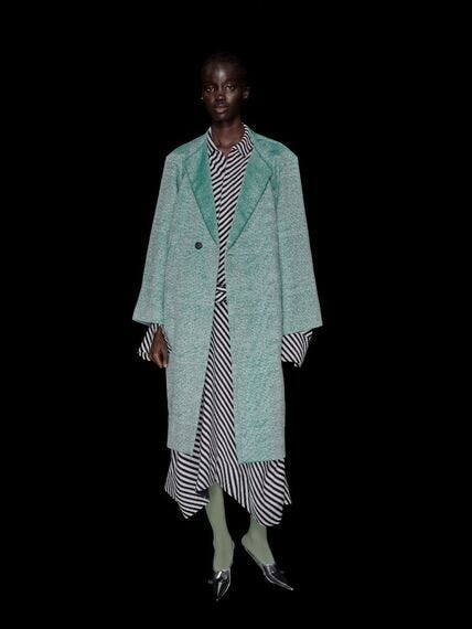 色はアウターにも積極的に使った。6色の糸を使ったオリジナルのカットジャカードは、表面に糸を長く出し、ファーのような見た目だ。ノーカラージャケット(9万7900円)などを作った。生地は高度なジャカードに定評がある機屋、マルナカ(埼玉県飯能市)で製作した。グリーンが爽やかな印象のミニマルなコート(11万6600円)は、生地の経糸に用いたブライト糸で上品な光沢を持たせた。