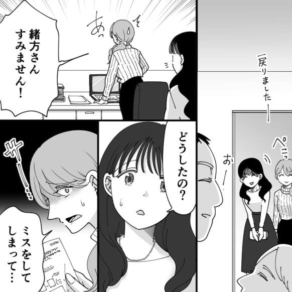 ミスをしてしまう主人公・さゆでしたが、緒方先輩がやさしくフォローしてくれました。