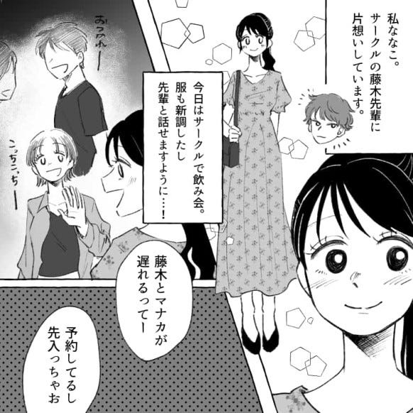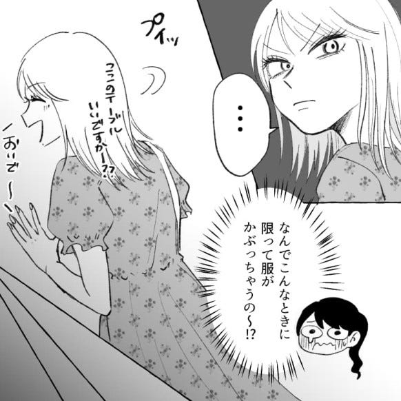 服も新調し、気あいを入れてサークルの飲み会に参加した主人公でしたが、なんと同期のマナカが自分と同じ服を着ていて……?