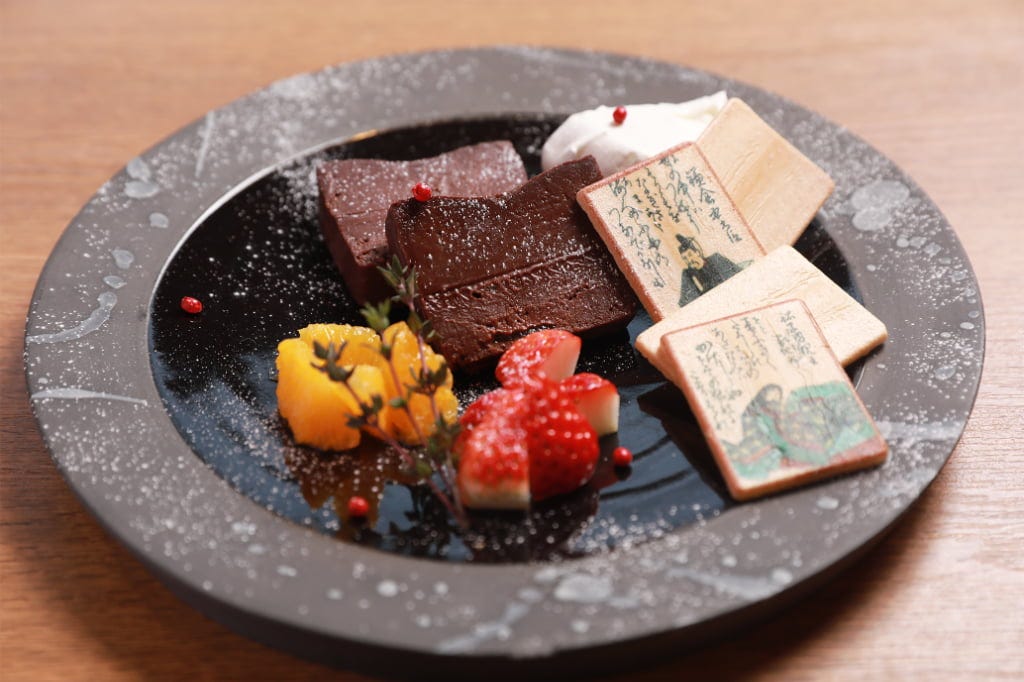 「霞梅~梅ほころび てりーぬしょこら~」(1,430円) 「Bakery&Café野坐2階カフェ」では、濃厚なチョコレートに城州白の梅を合わせた「梅ほころび てりーぬしょこら」を限定で提供。お好みでフルーツや、サクサクの「あも歌留多(最中種)」と一緒に楽しめるスペシャルな一皿です。